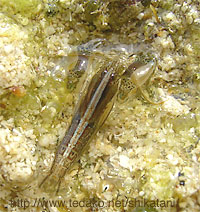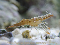 テナガエビ亜科のエビ Palaemonidae これは、茶色い流れ藻に付いていたエビ。