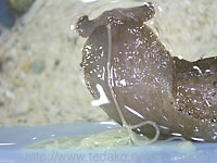 ミドリアメフラシ? Aplysia oculifera ? 容器の水面近くに、紐状の黄色い
