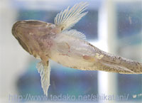 水槽のガラスに産卵するハゼの仲間 産卵管を伸ばして、一つずつ卵を