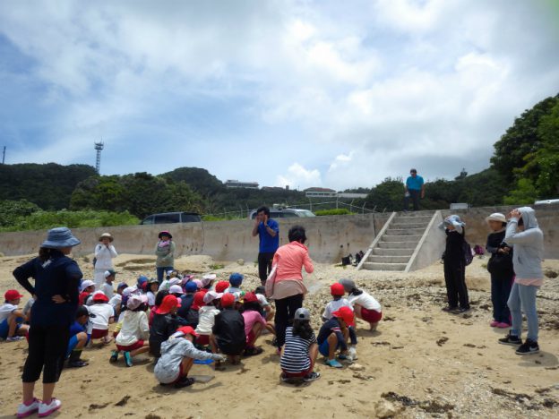 知念小学校の3年生と一緒に、学校の近くの海を歩いて来ました。台風の接近で雨が心配でしたが、雲のおかげで暑くもなく、幸い雨もふらずに海歩きをすることができました。 先生から、観察する時の注意を聞いて、さあ …