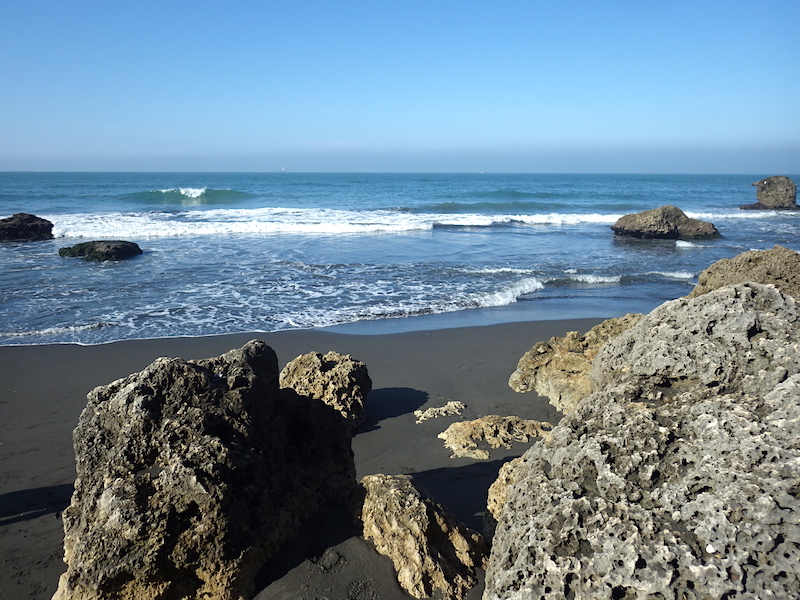 海岸は、石灰岩の岩礁で、砂は黒。河口に近いので、川からの砂だと思います。沖の岩を見ると、藻類やカキやフジツボの帯状分布がよくわかります。