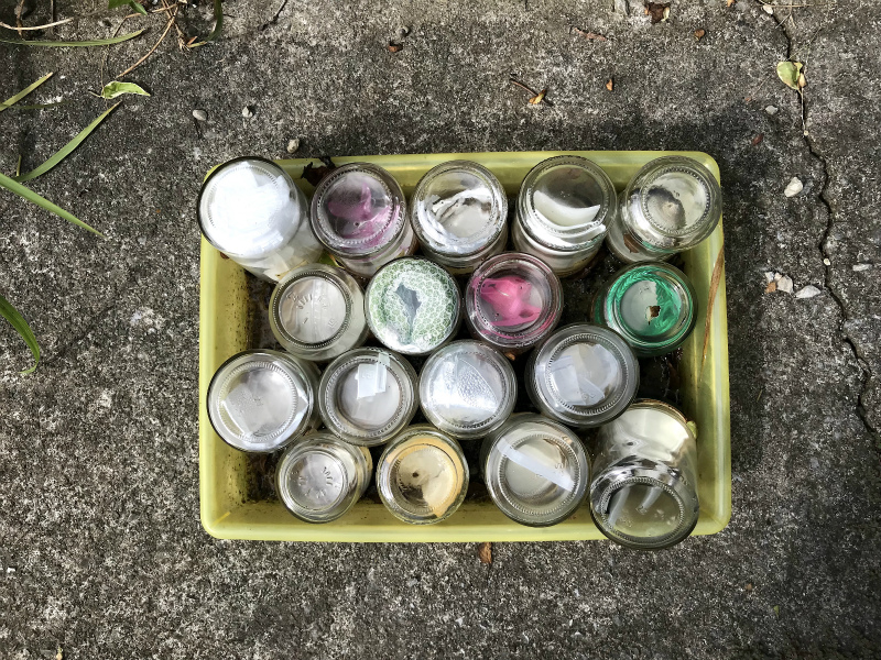 実験セットをベランダから野外の草むらに移動させてからは、カタツムリの摂餌行動の影響が強く現れています。生物による物理的な破壊は、予想以上でした。これは同時に、石などの表面に生える微細な藻類を食べているカタツムリなどの生物の多くが、野外に捨てられたプラスチックを誤って食べていることも、示しています。