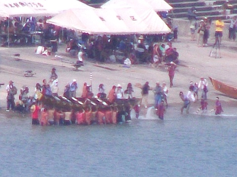 レースの途中で船を転覆させて、全員海に飛び込んで、船を戻すところ。