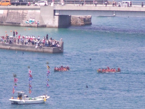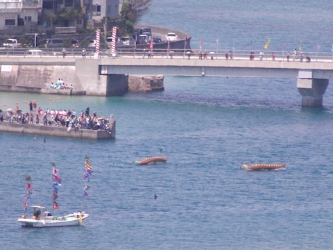 奥武島ハーリーには、転覆レースや橋からの飛び込みレースもあって