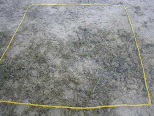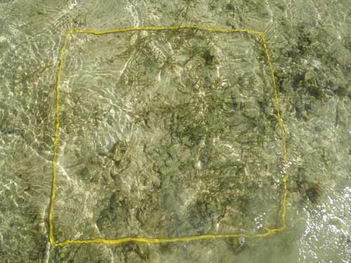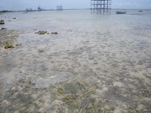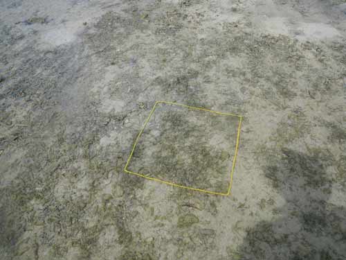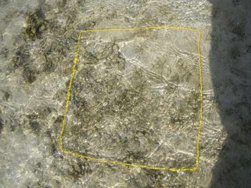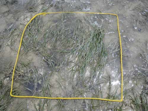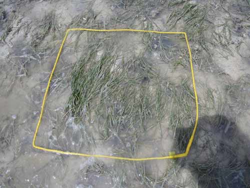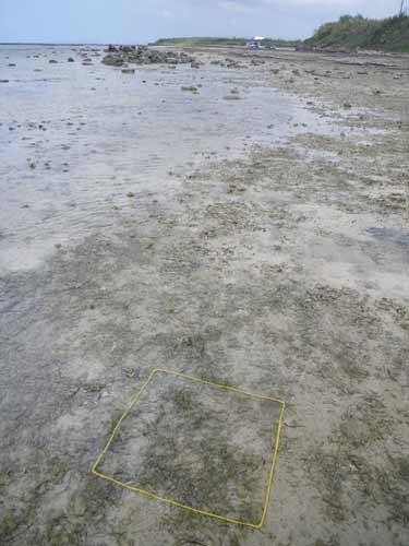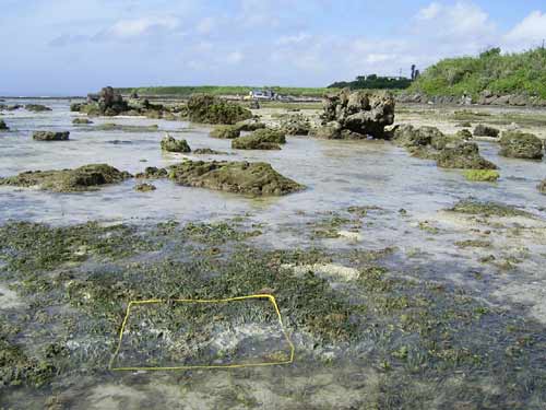 駐車場から離れた所にある、イノーの縁に茂るコアマモの藻場です。地下水が湧いて汽水となる場所を好んで生えるため、パッチ状になります。 各月の概要はこちら。