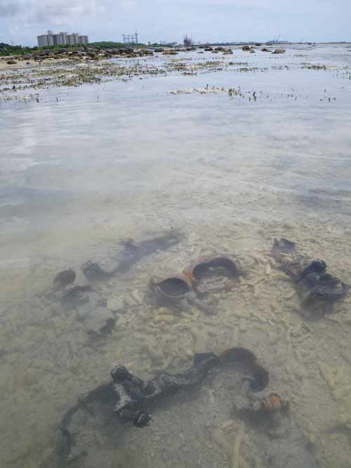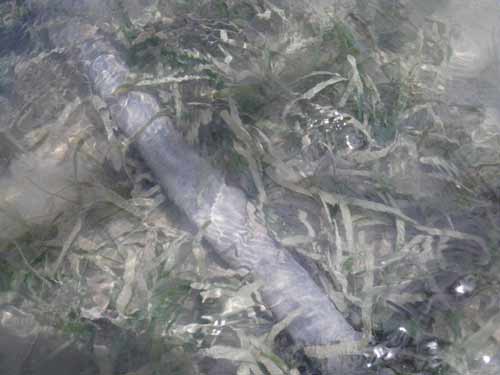コアマモ地点の近くにある、橋桁のボーリング調査のやぐらです。海草を踏みつけてます。葉の上には泥。すでに終了した調査の跡には、土砂と一緒にゴミをポイ捨て。 |